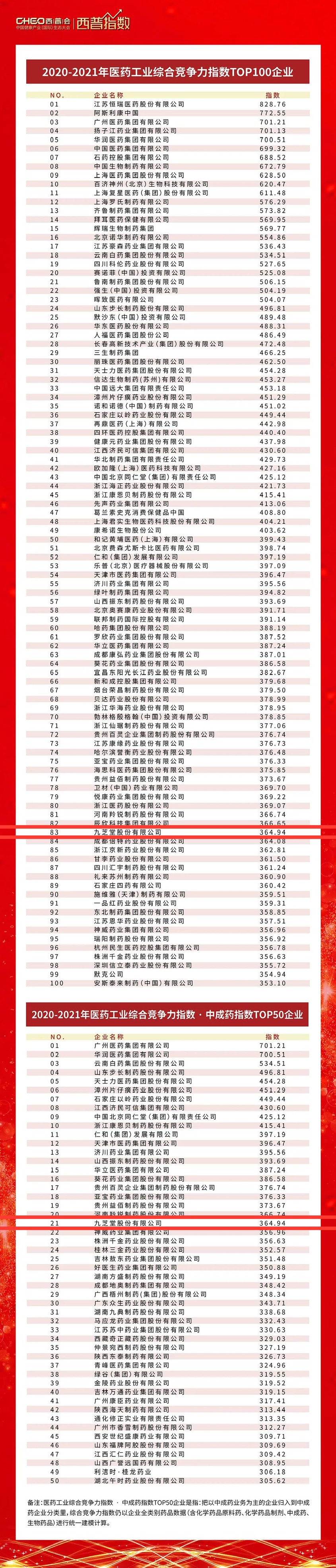 2020-2021年医药工业综合竞争力指数TOP100企业权威发布,九芝堂实力上榜!