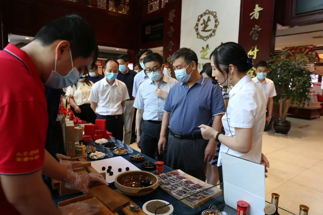 在徐总、郭总的陪同下,闫树江副局长一行仔细参观了九芝堂产品陈列馆、九芝堂企业文化馆、中医药博物馆及中医门诊部、中医针灸推拿外治中心等中医诊疗与健康养生项目。省中医药管理局局长郭子华向闫树江副局长介绍了九芝堂中药文化传承发展情况,在国家中医药发展战略指引下,作为拥有“中华老字号”、“国家级非物质文化遗产”称号的中药企业,九芝堂践行使命,积极投资建设中医药文化科普馆,传承发展中医药文化,先后被评选为国家首批中医药健康旅游示范基地、湖南省中医药文化宣传教育基地、长沙市专业科普基地、长沙市中小学生研学实践创建基地等。对九芝堂在中药健康养生体验和中医药文化科普宣传方面所做的工作,闫树江副局长一行给予了高度赞许。
