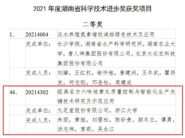 2023年2月24日,湖南省科技创新奖励大会在长沙召开,大会公布和表彰了2021年度湖南省科学技术奖获奖项目。省委副书记、省长毛伟明出席并为获奖代表颁奖。经省科学技术奖励评审委员会评审,省科学技术奖励委员会审定,省人民政府批准,九芝堂的“经典名方六味地黄丸质量控制与智能化生产关键技术研究及示范应用”项目被授予湖南省科学技术进步奖二等奖。在本次获奖项目中,以生物医药企业为第一完成单位的仅2项,其中九芝堂是唯一一家以第一完成单位获奖的中药企业。