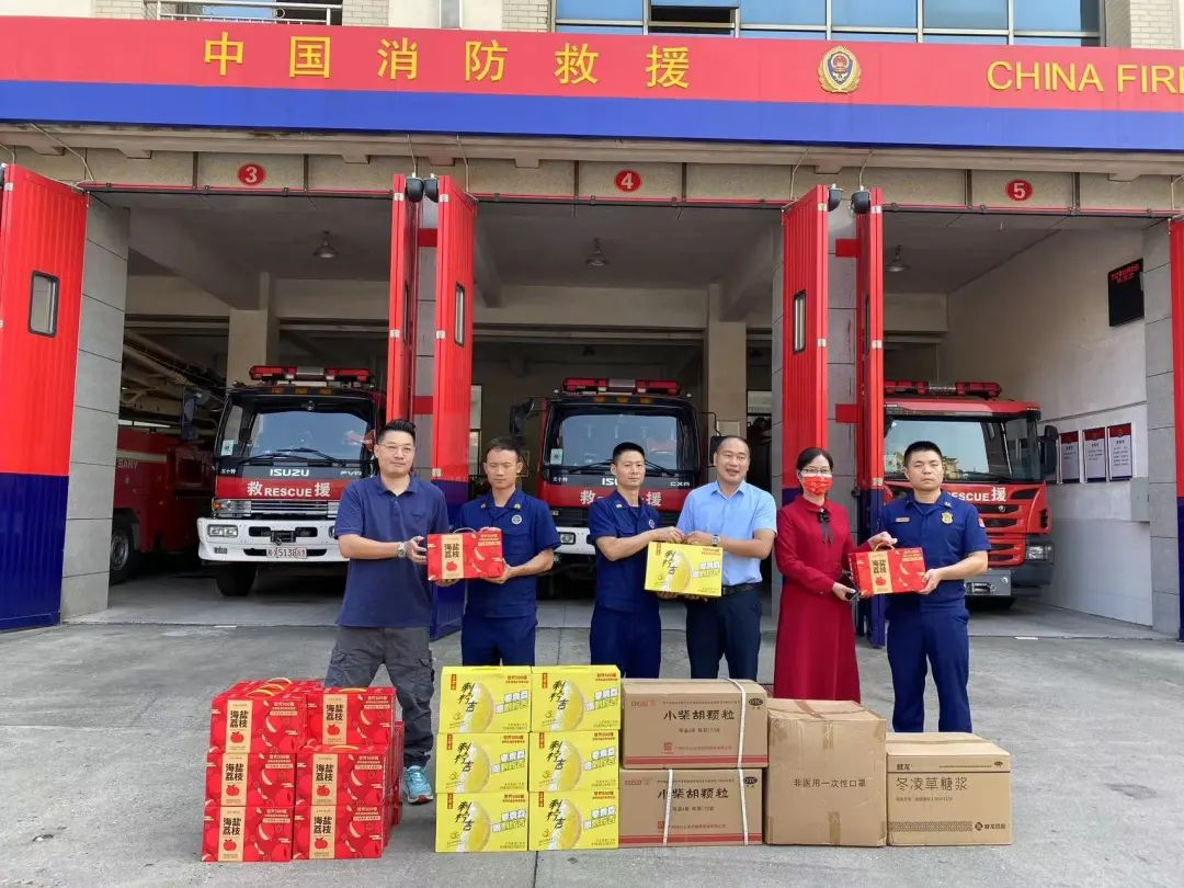 9月28日,九芝堂连锁携手广州白云山医药销售有限公司湖南办来到长沙市岳麓区消防救援大队进行慰问。九芝堂医药总经理助理兼九芝堂连锁外联拓展经理黄赛、白云山医药销售公司销售部副部长杨亮斌和湖南湖北终端负责人吴少锋共同为坚守在救援消防一线的消防战员们送上防暑防疫必备的药品、口罩,有针对性地助力消防救援指战员在训练和任务中解暑消热,防护身体健康,并向奋战在消防一线的消防战员表达了诚挚感谢,感谢他们为这座城市的消防安全的辛劳付出,为星城百姓的平安保驾护航。每一个消防救援大队指战员都是我们心目中的英雄,是九芝堂及白云山员工学习的榜样。